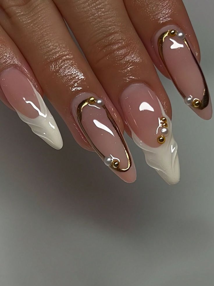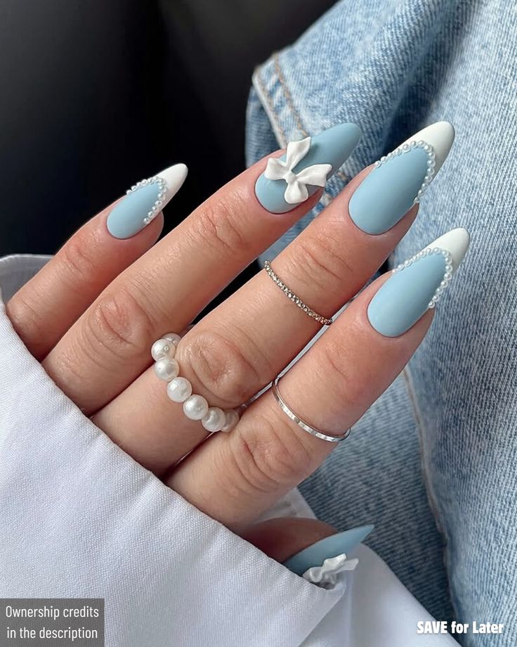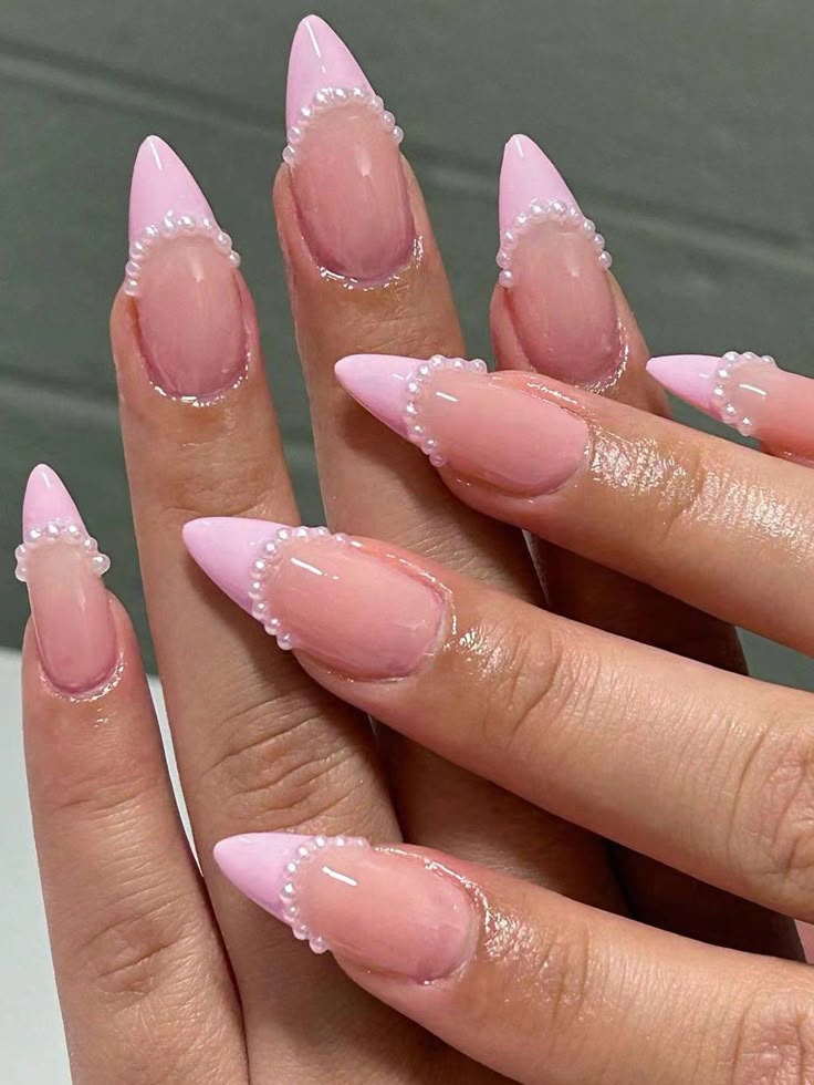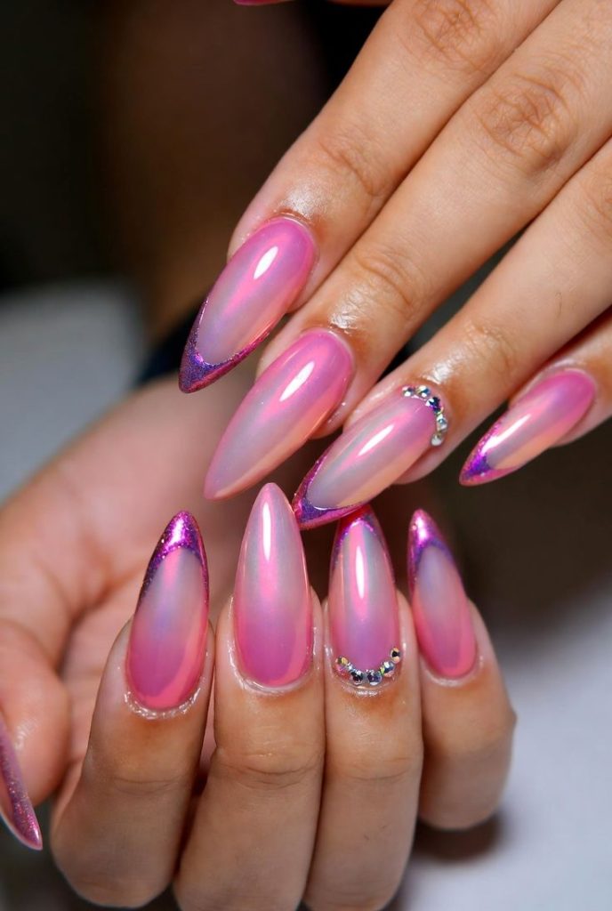 Tiny pearls nestled at cuticles on chrome bases.