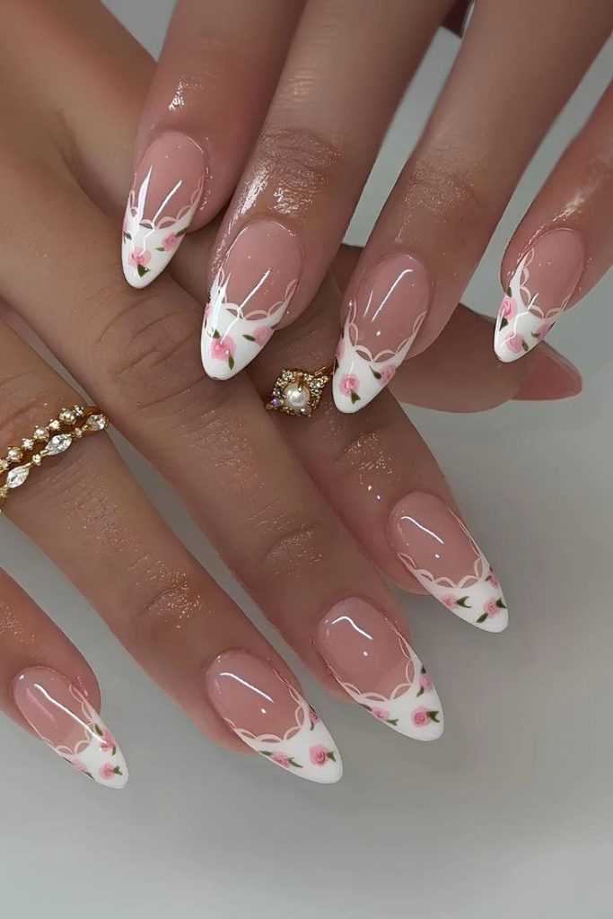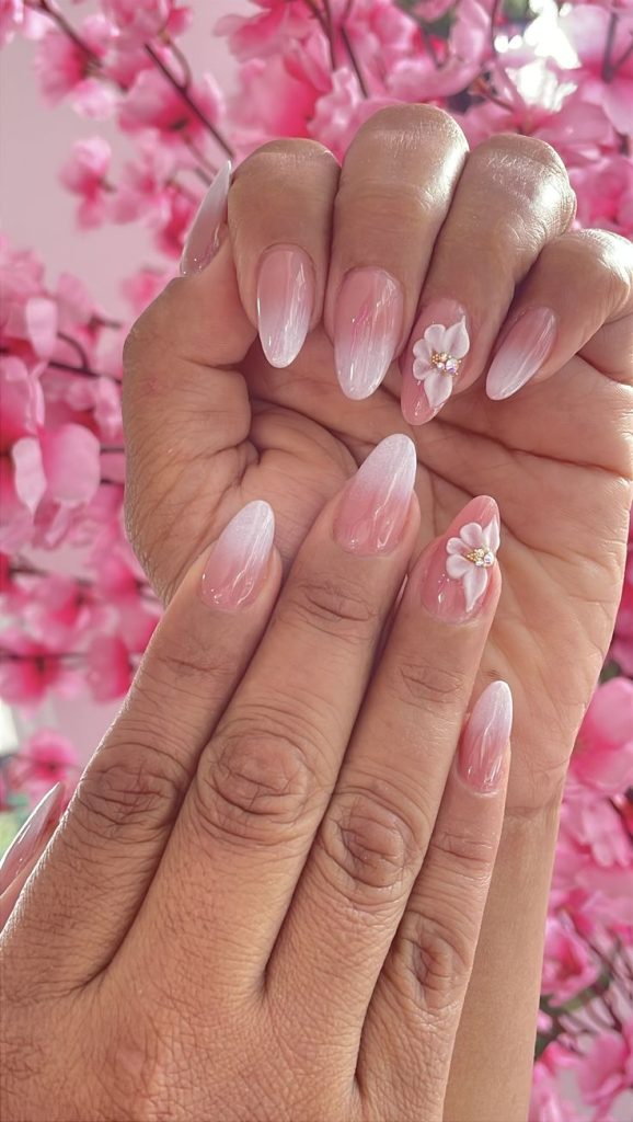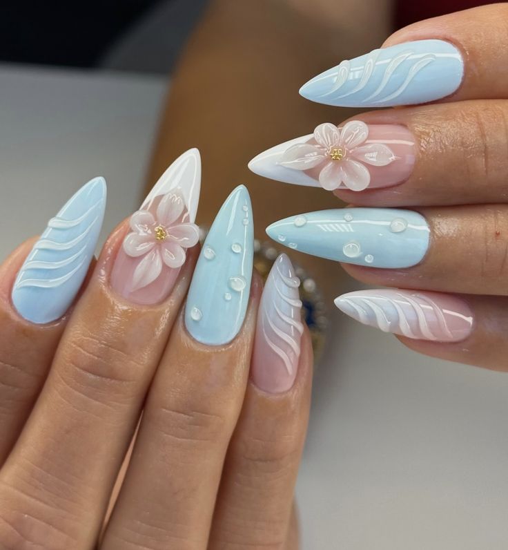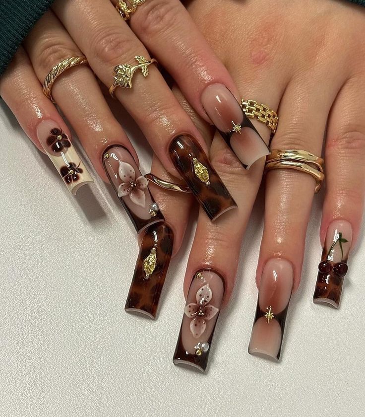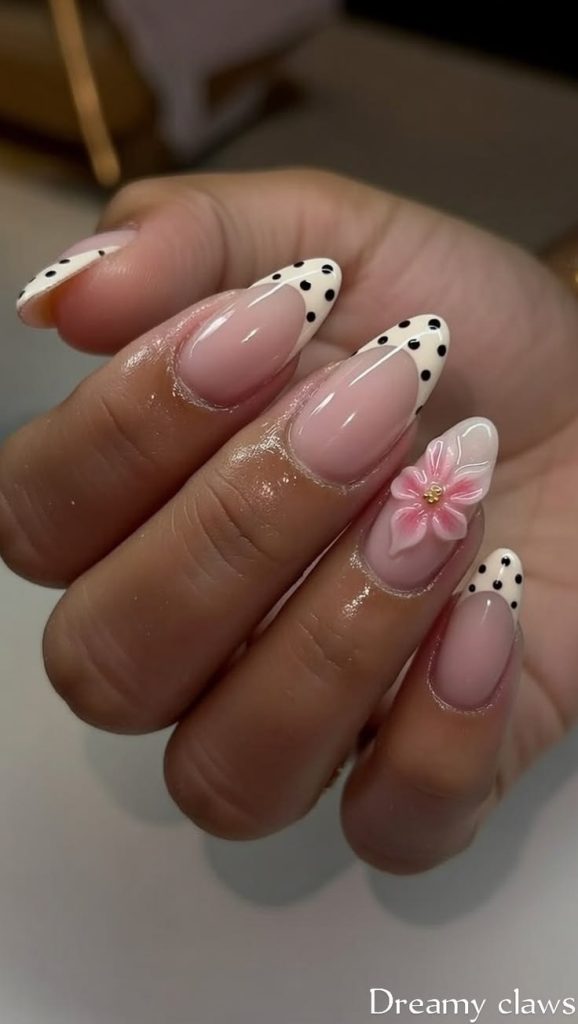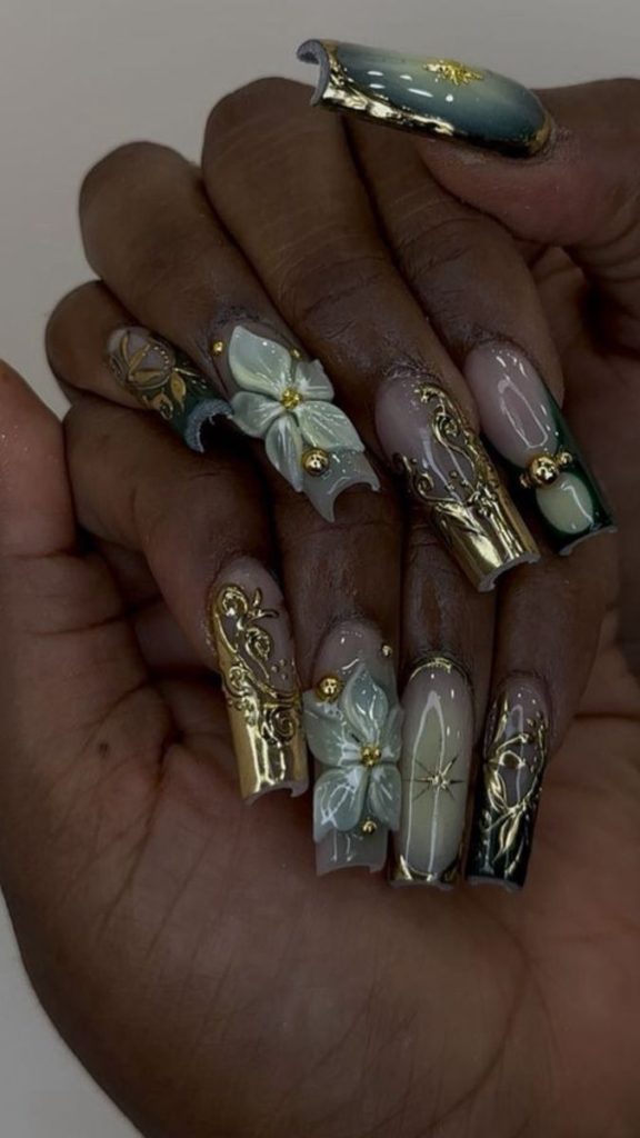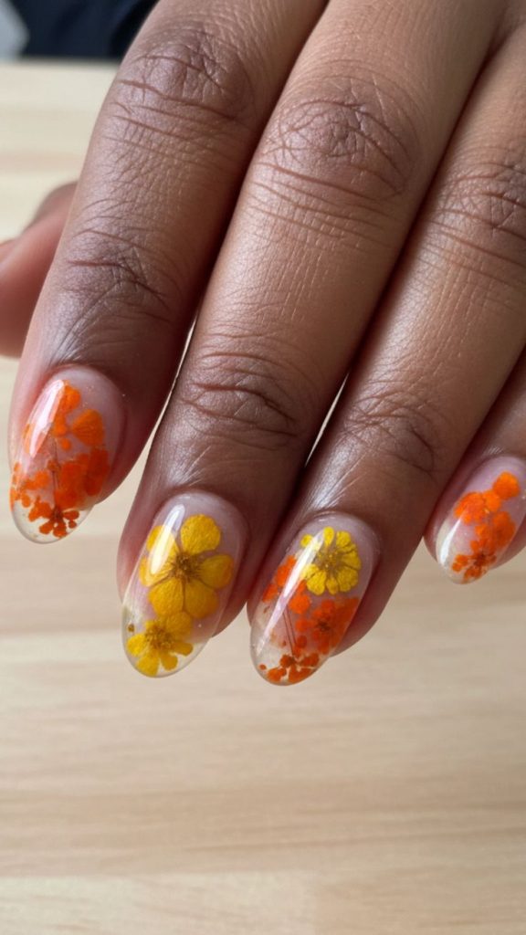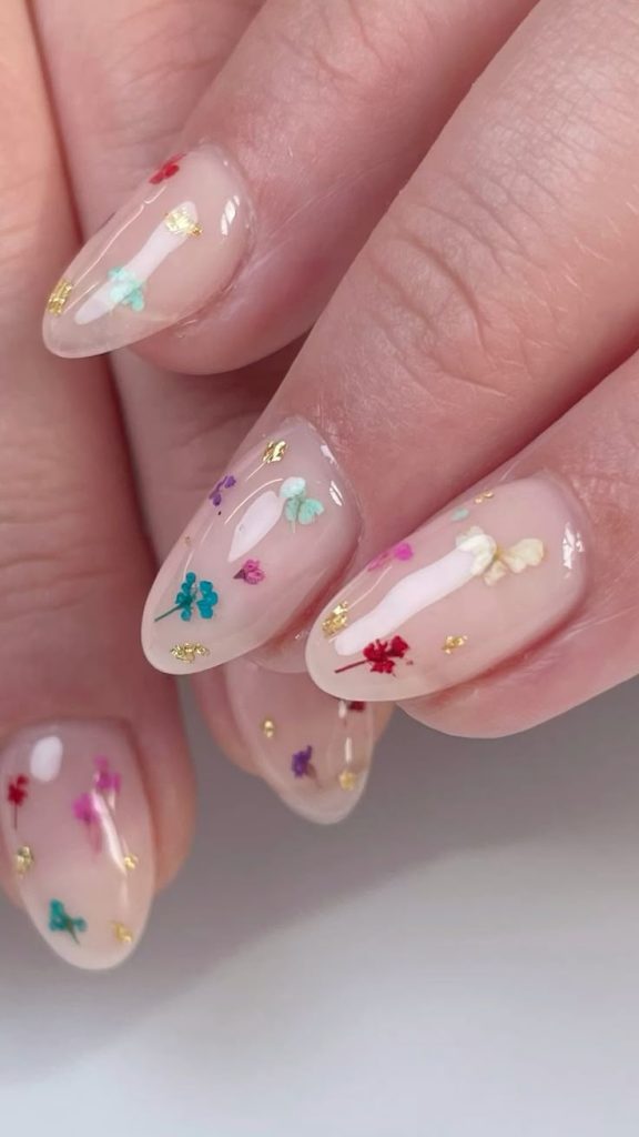 Pressed flowers suspended in translucent jelly create a romantic, ethereal look. Tiny baby’s breath, lavender, or rose petals captured within the layers give the manicure a preserved, timeless quality.