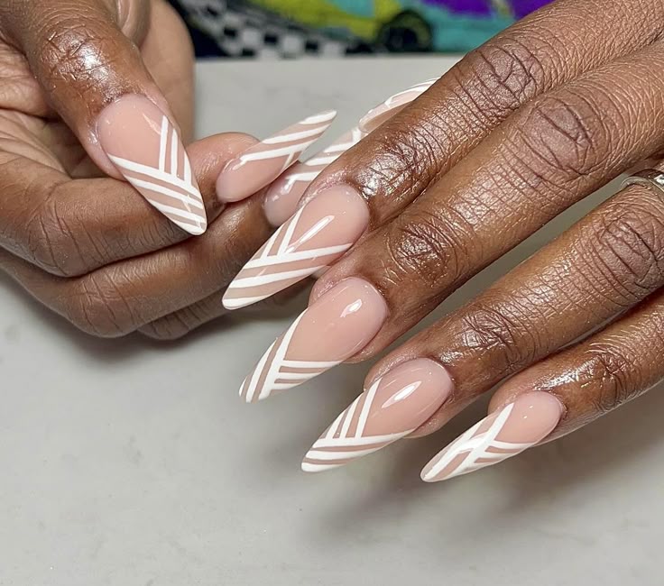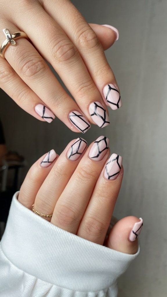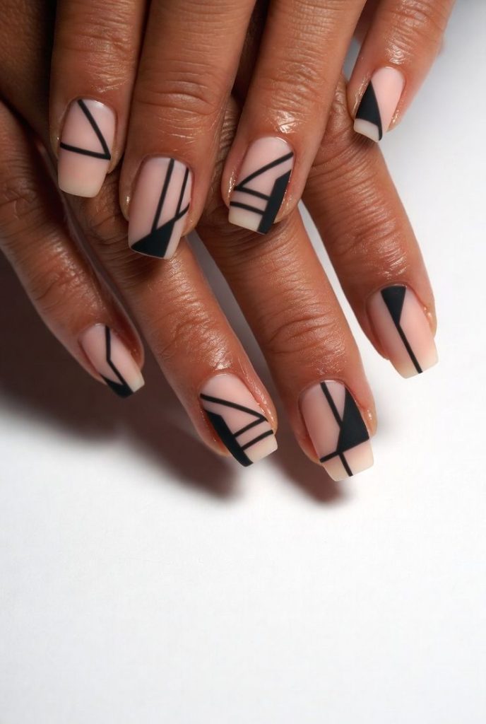 Strategic bare nail areas combined with jelly accents for a minimalist, architectural look. Geometric shapes, stripes, or abstract designs allow the natural nail to become part of the art.