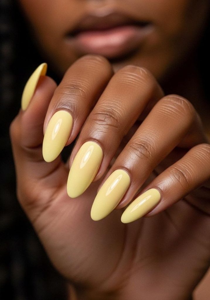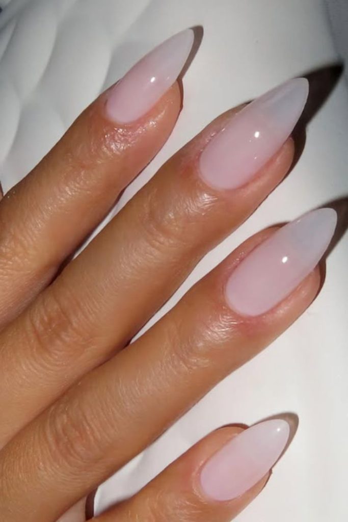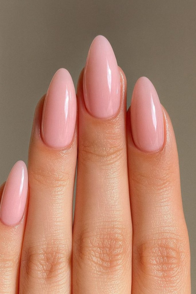 Elongated almond nails showcase the depth and dimension of jelly polish beautifully. The curved shape complements the soft, organic quality of the jelly finish.