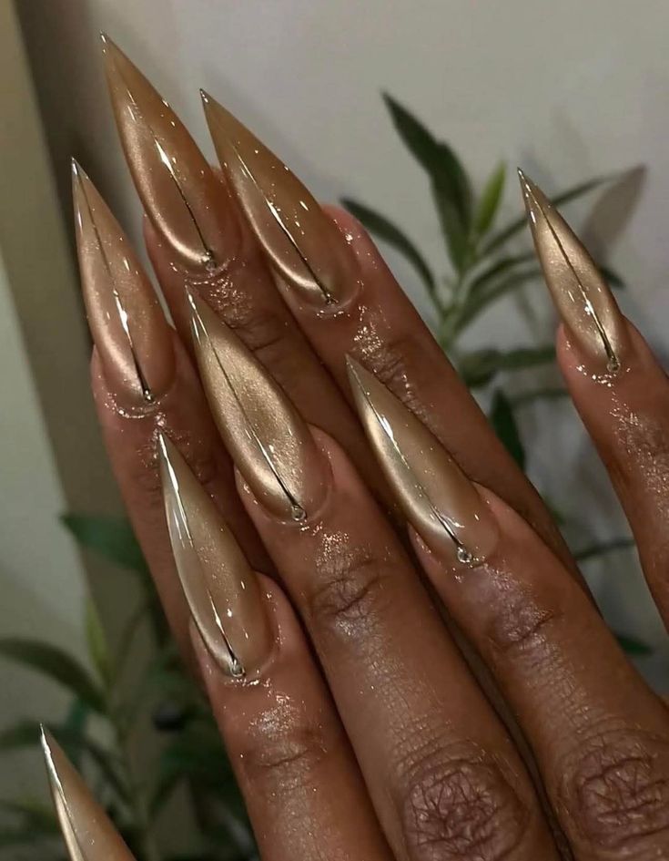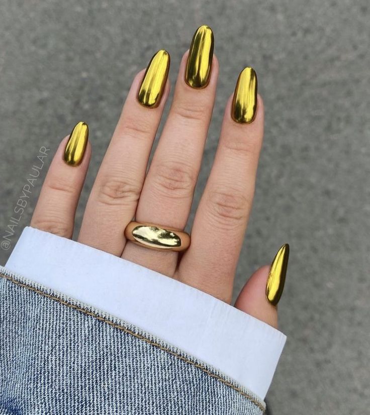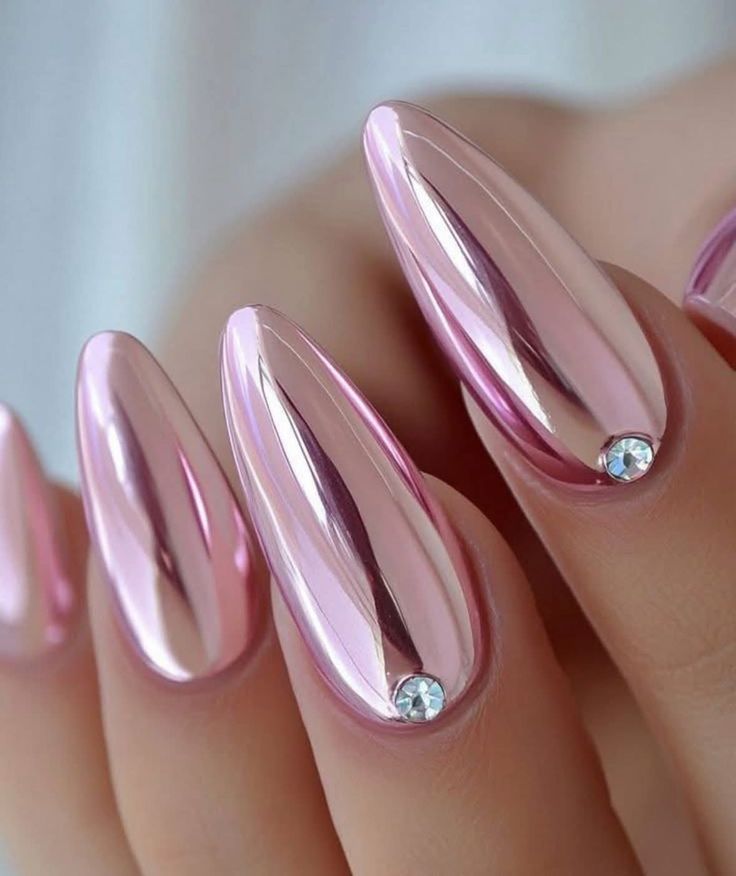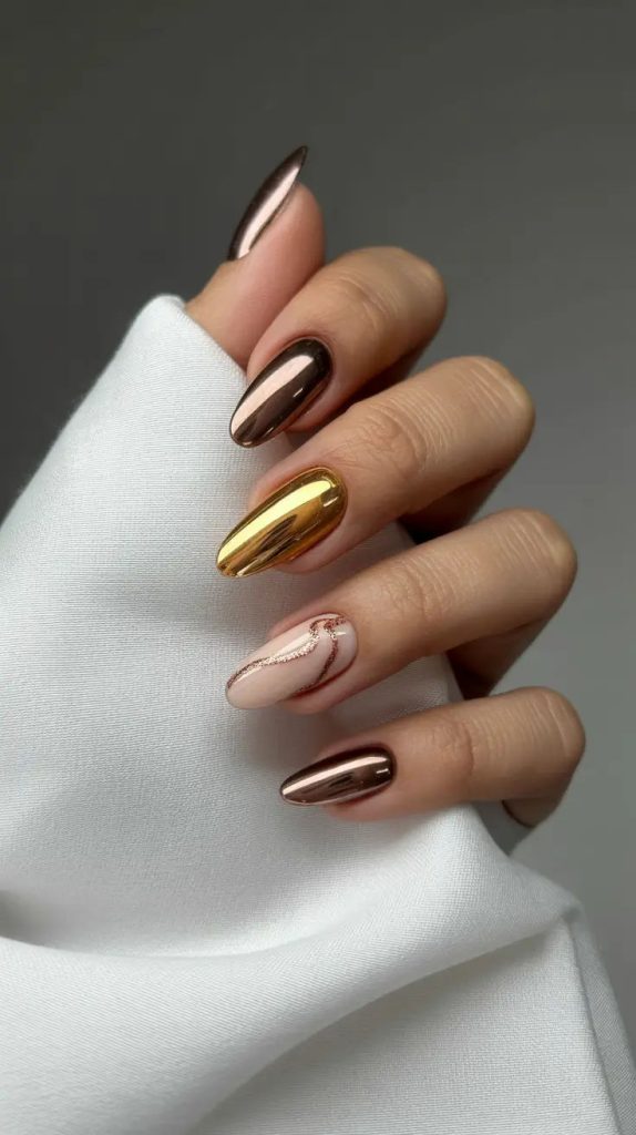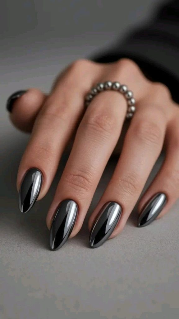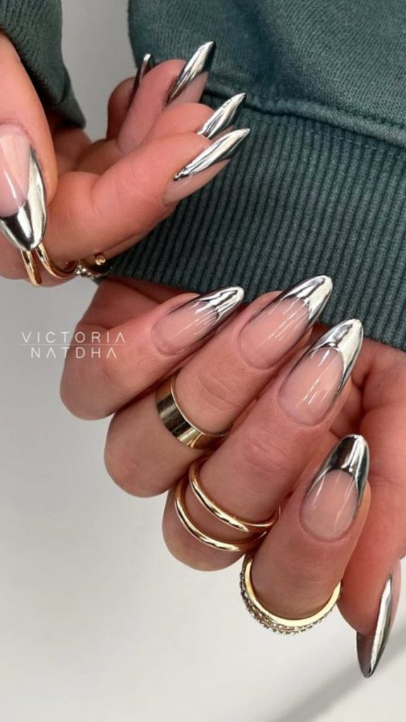 Mirror finishes paired with bare nail for modern contrast.