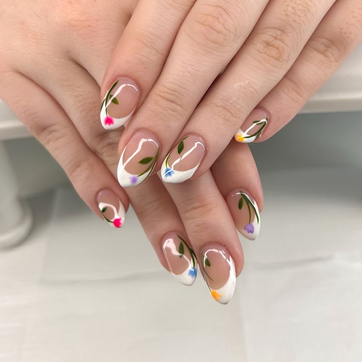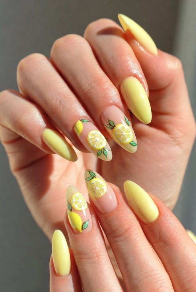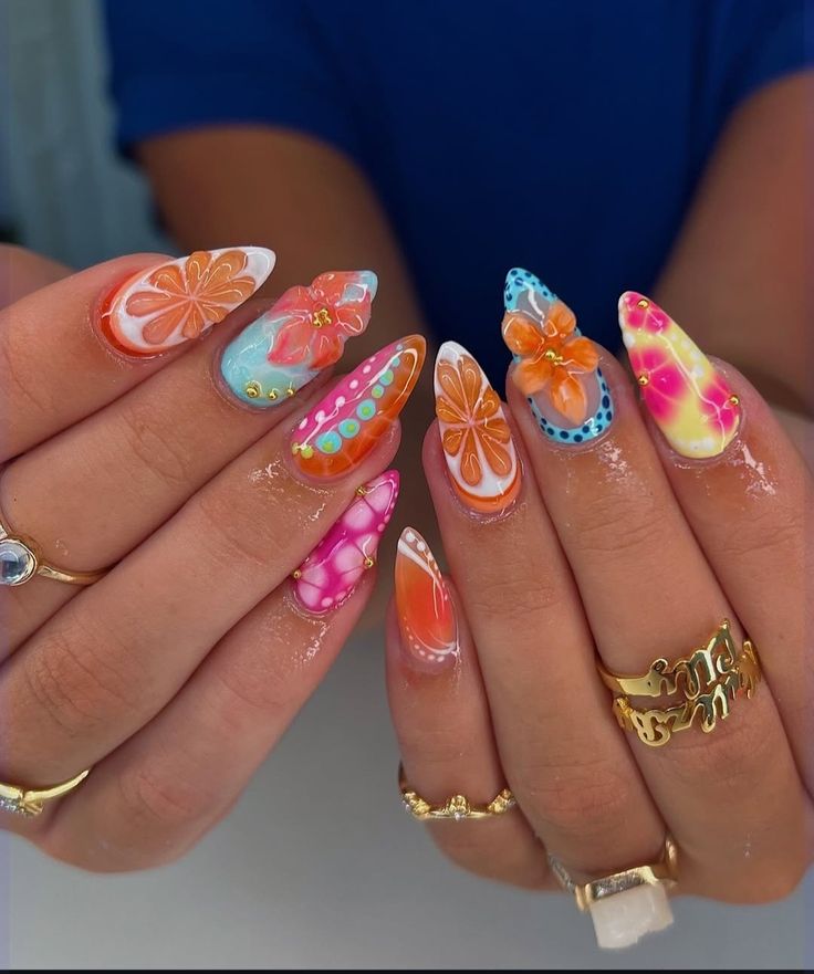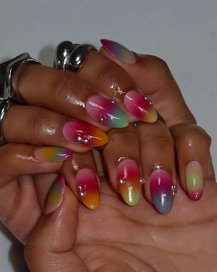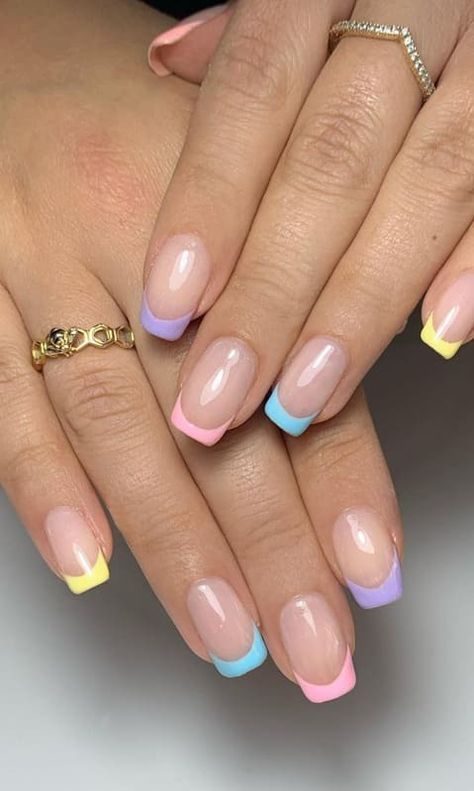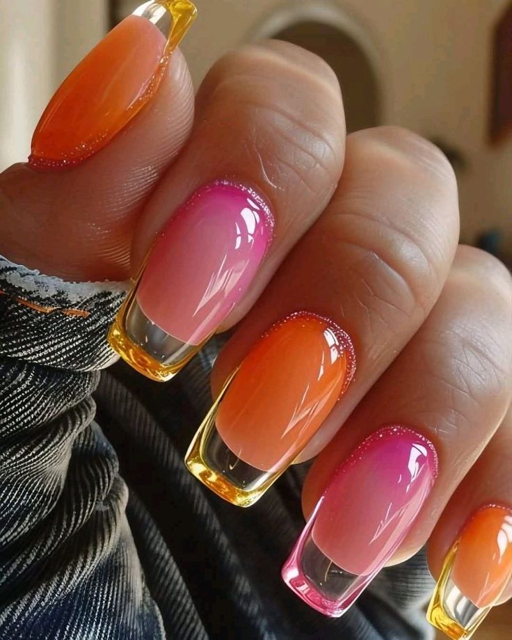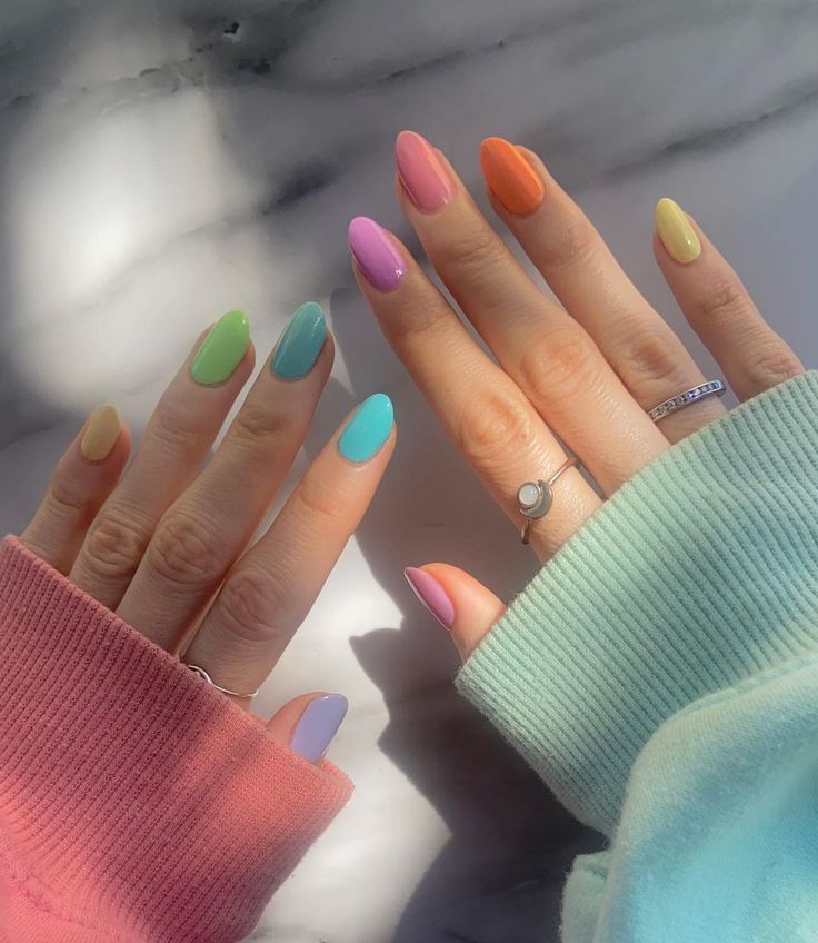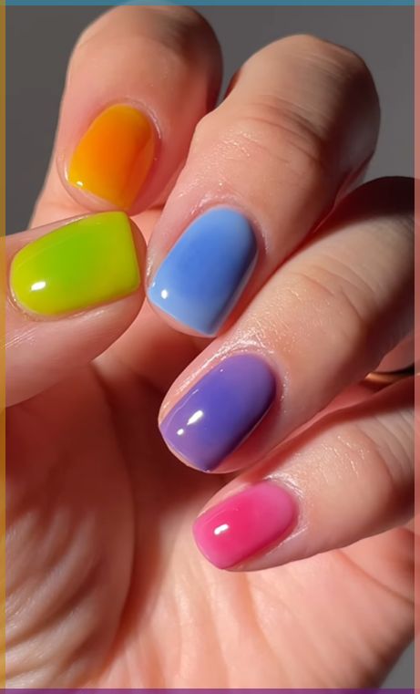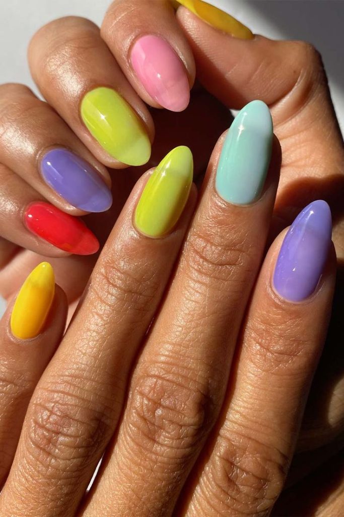 Each nail a different jelly color—pink, orange, yellow, green, blue, purple—for a cheerful, colorful manicure. This design celebrates the versatility of jelly polish and always draws compliments.