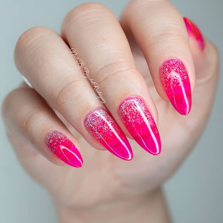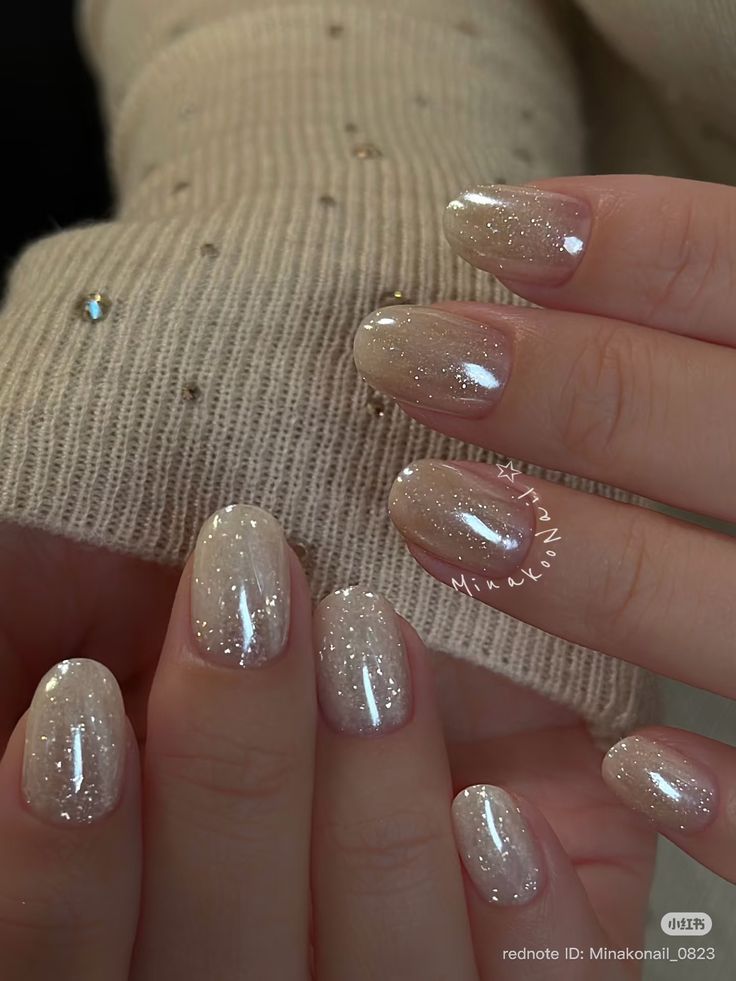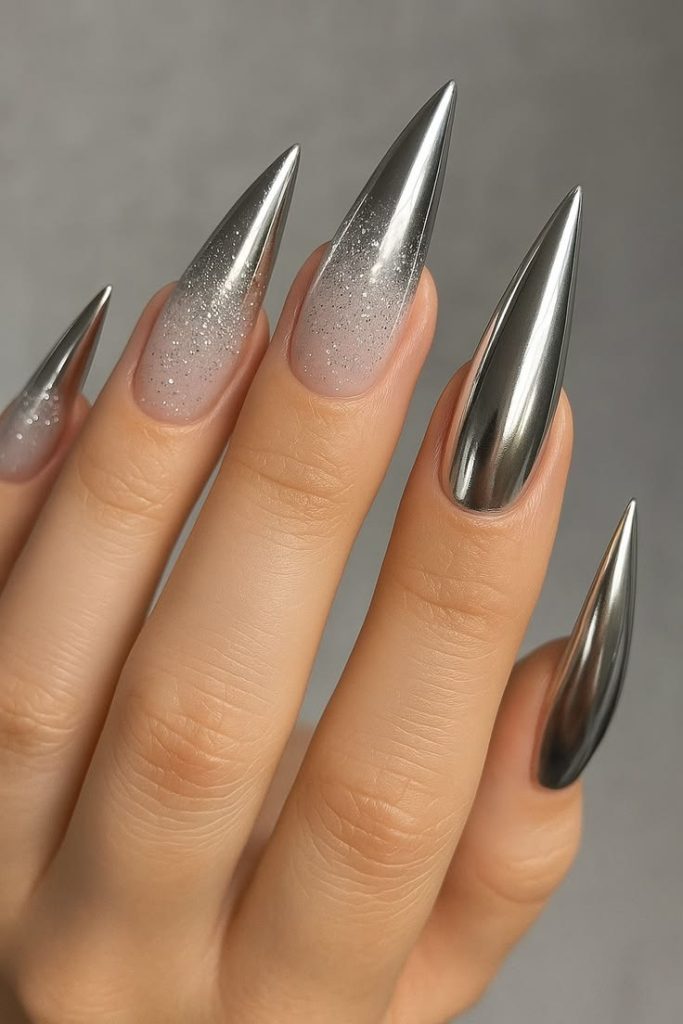 Subtle glitter fade at tips over chrome bases.