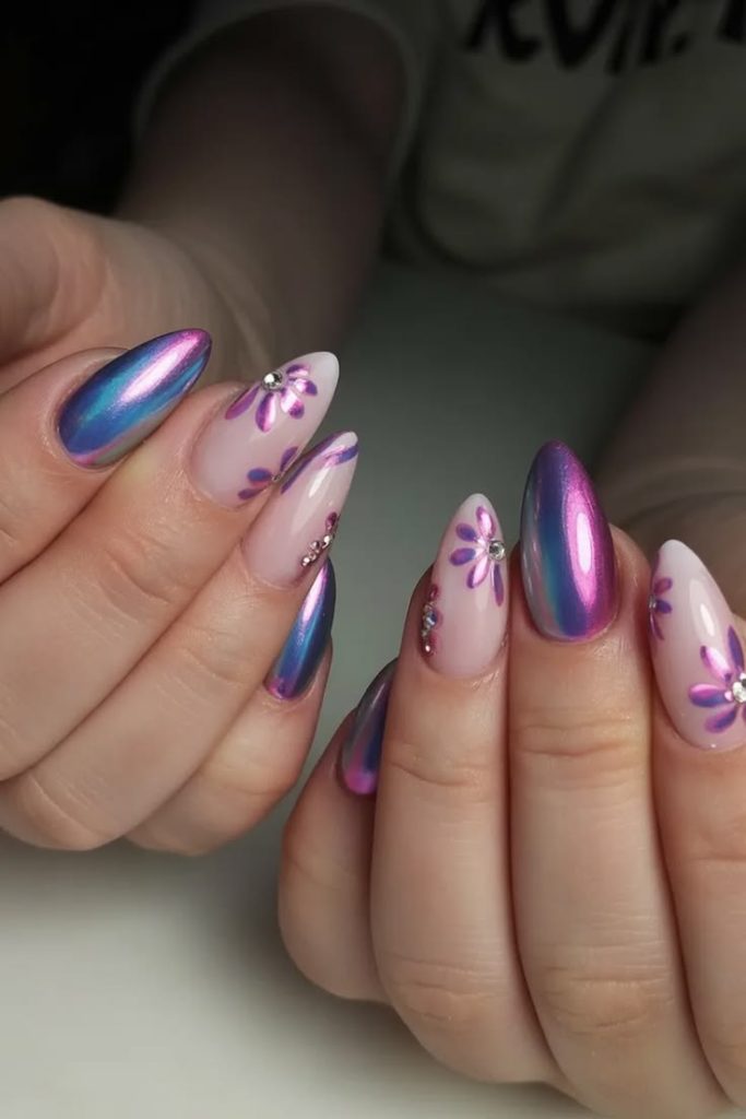 Vanilla chrome leads spring trends, paired with soft pastels and floral accents. Blush pink and lilac chrome offer fresh alternatives .