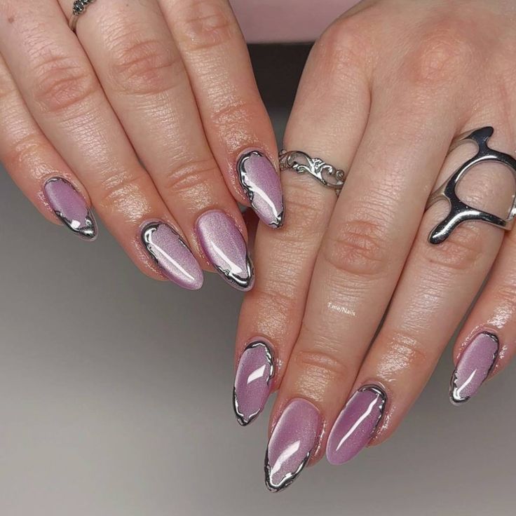 A jelly base paired with chrome powder details on the tips, cuticles, or as abstract accents. The combination of translucent color and reflective chrome creates a futuristic, high-fashion look.