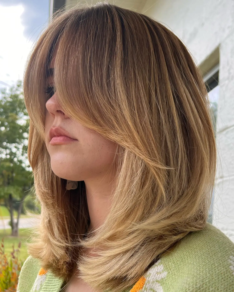 Curtain bangs are parted in the middle or slightly off-center and sweep to the sides, blending seamlessly into the face-framing layers. Paired with shoulder length layers, the look is soft, romantic, and on-trend.