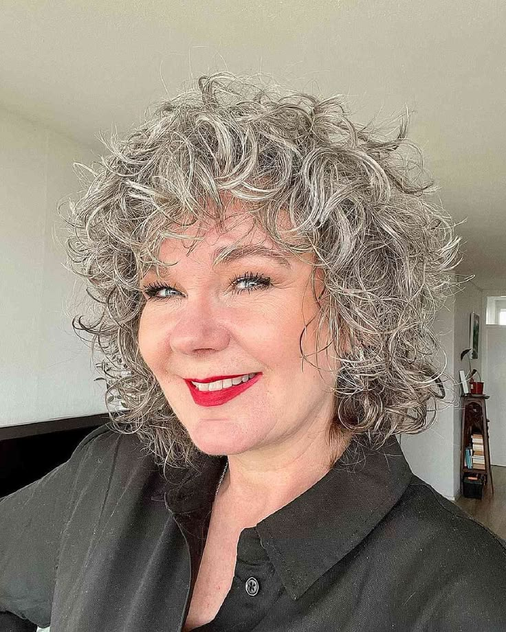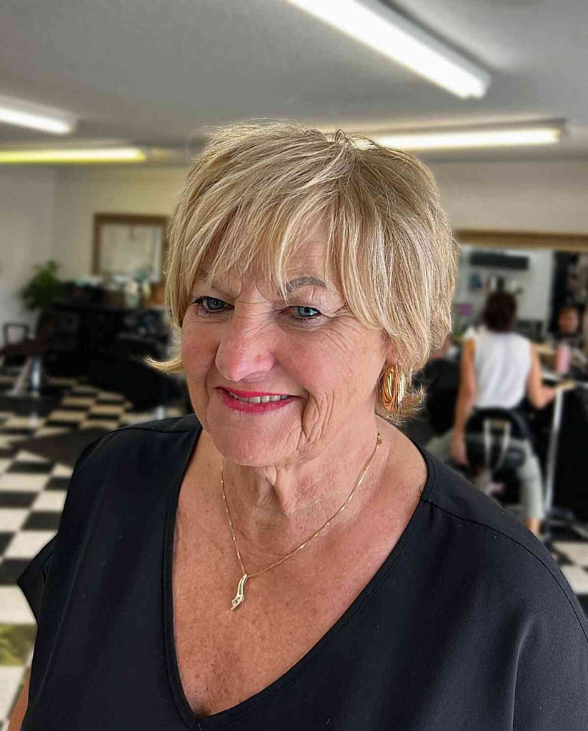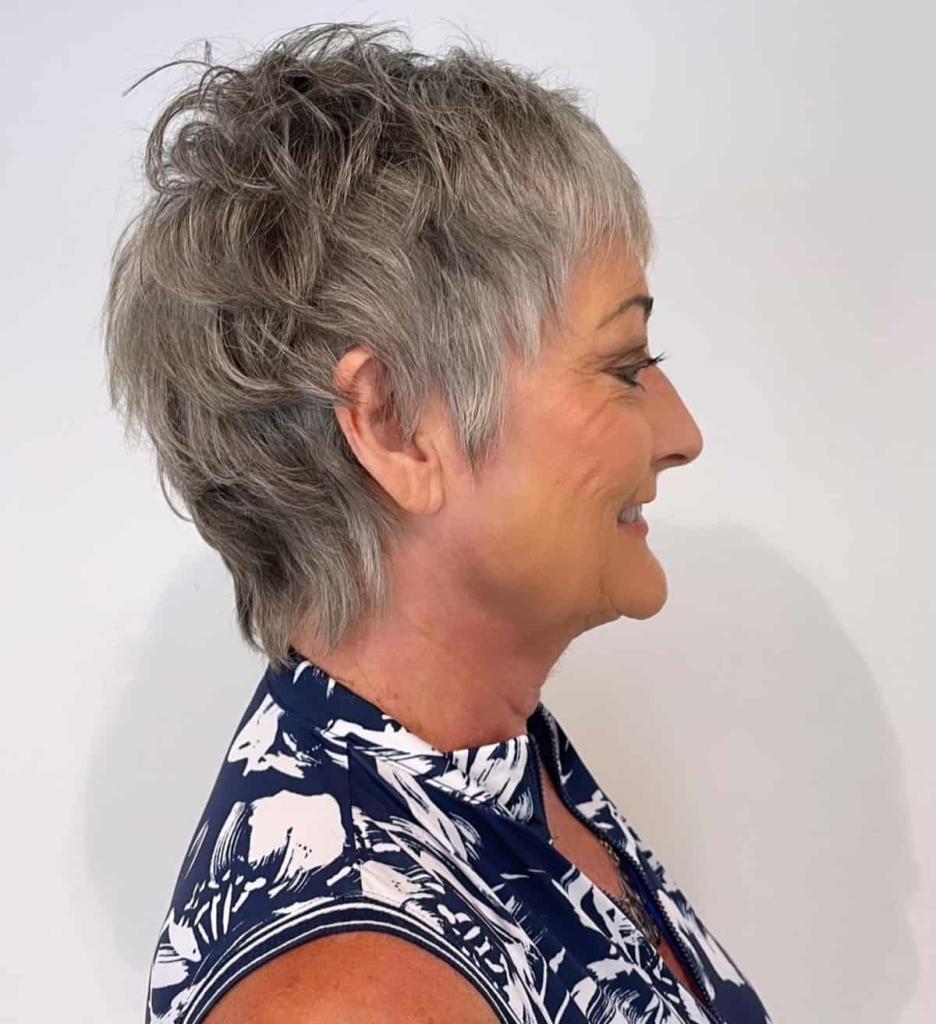 Adding wispy bangs to short shag haircuts for older women creates a soft, romantic frame for the face. The bangs are cut with texture, not bluntness, and can be parted in the middle or swept to the side.