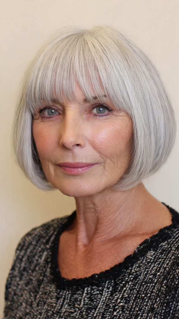Micro bangs work exceptionally well for older women because they draw the eye upward, away from any thinning at the crown or along the part. They also add a deliberate, confident edge that prevents the cut from reading as “safe” or dated.