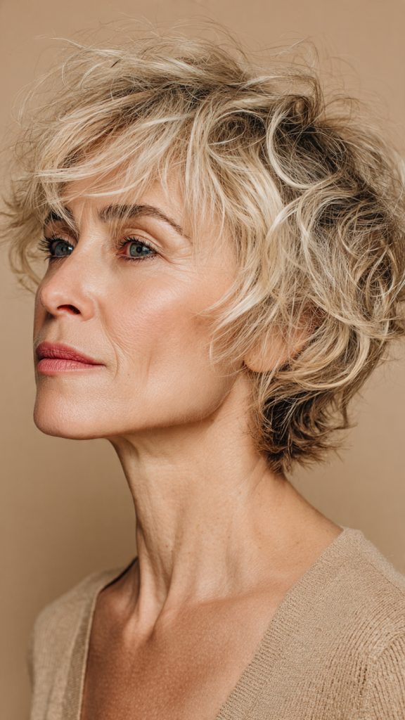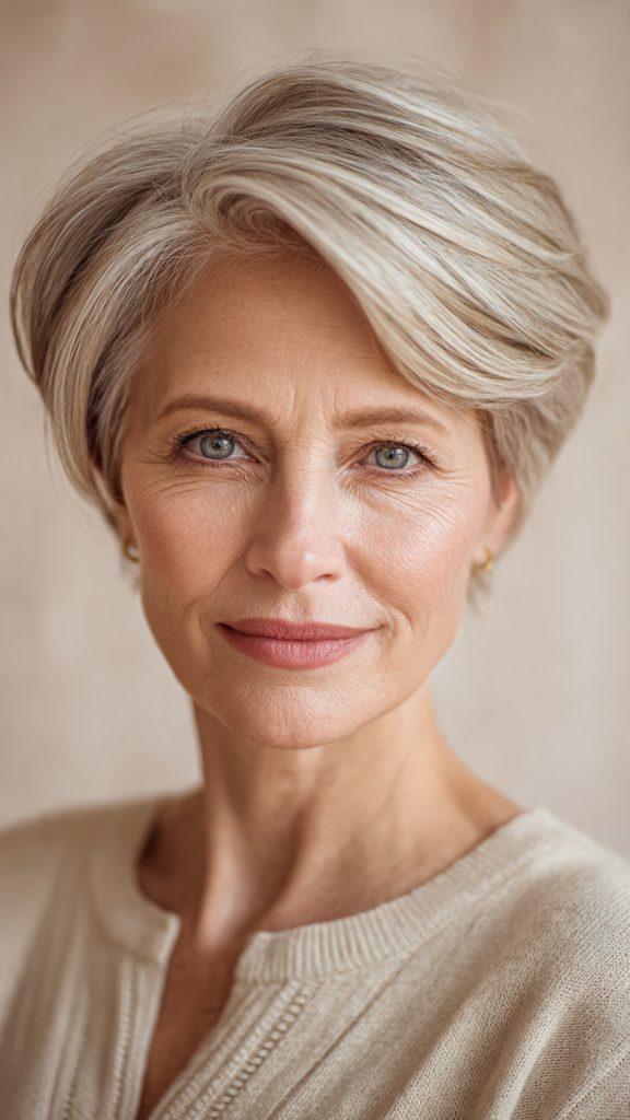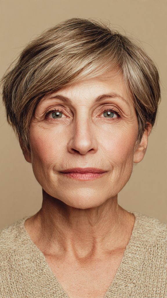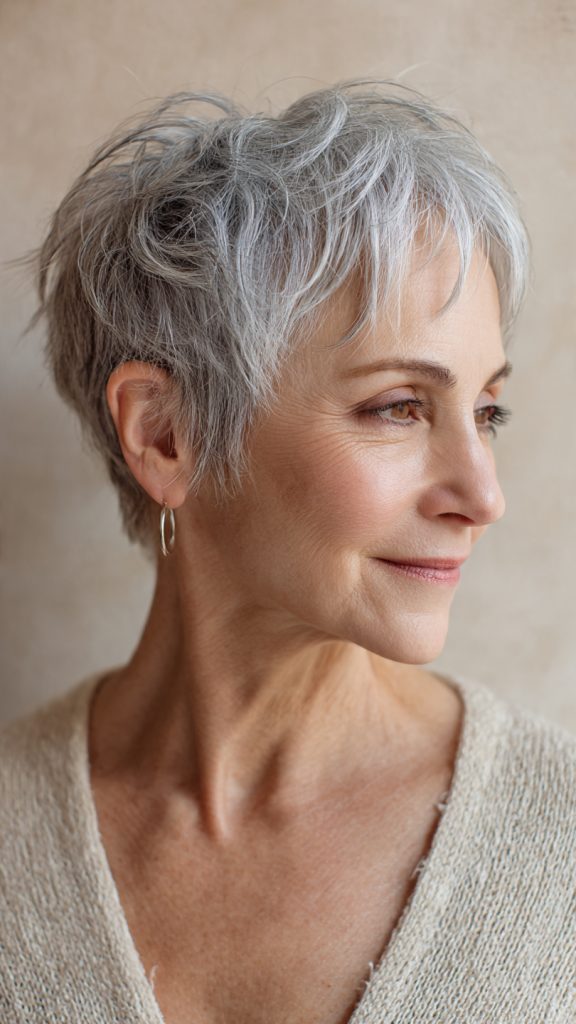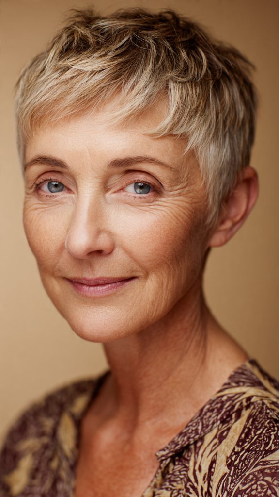 For women over sixty, the pixie bob is particularly forgiving. It works with mature hair texture (which often becomes finer and less dense), requires minimal daily effort, and looks modern without trying too hard. The thirteen cuts below represent the best of this hybrid style.
