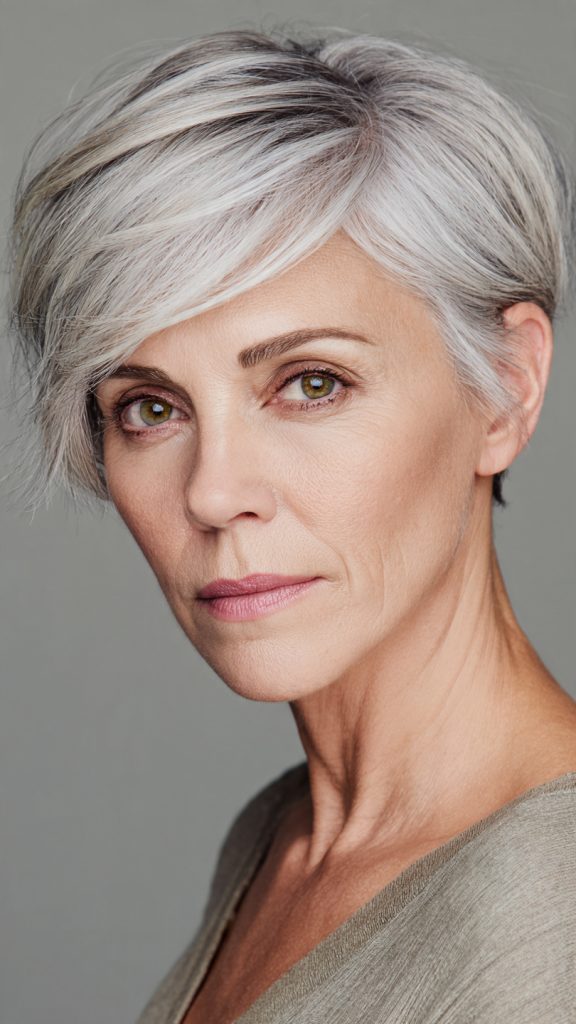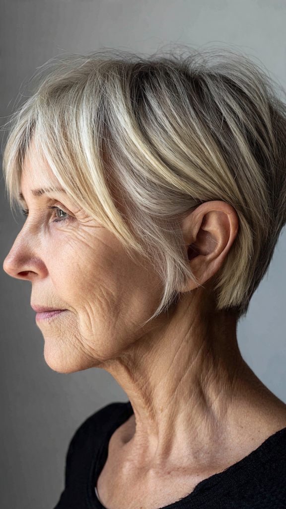 The side swept bangs blend seamlessly into the longer front sections of the pixie bob, creating a continuous, flowing line. This cut is particularly flattering for older women because the bangs draw attention to the eyes while minimizing any concerns about the hairline.