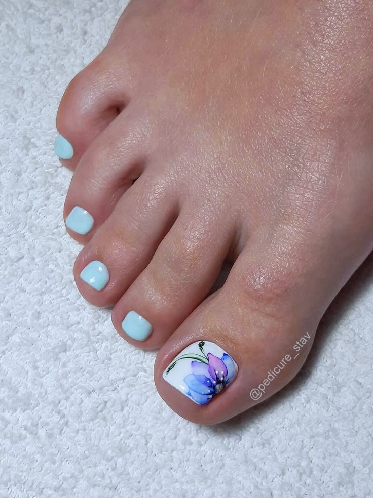 A soft, artistic design where delicate flowers are painted with a translucent, watercolor-like effect. Using a fine brush and diluted polish or gel, the artist creates soft, blurred petals that blend seamlessly into a sheer or nude base. The result is romantic, ethereal, and looks like tiny hand-painted artwork on each toe.